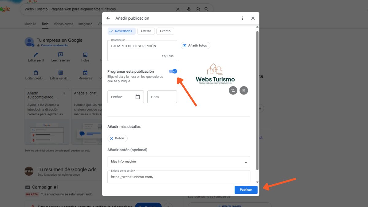 Además, Google también nos da la opción de programar publicaciones. Haciendo clic en “Programar publicación” podremos elegir el día y la hora en la que queremos que se publiquen las novedades.